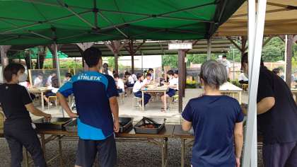 朝食タイムです 公開日 2022/07/22 更新日 2022/07/22 5年 朝食のお味噌汁は、宮滝野外学校の近くで作られたお味噌で作られているそうです。「美味しかったー!」と大人気のお味噌汁で、大きな鍋のお味噌汁がみるみるなくなっていきました!