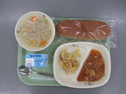 今日の献立は、牛乳、黒糖パン、フライドポテト、ポークチャップ、マセドアンスープ(大豆や野菜たっぷりのスープ)でした。