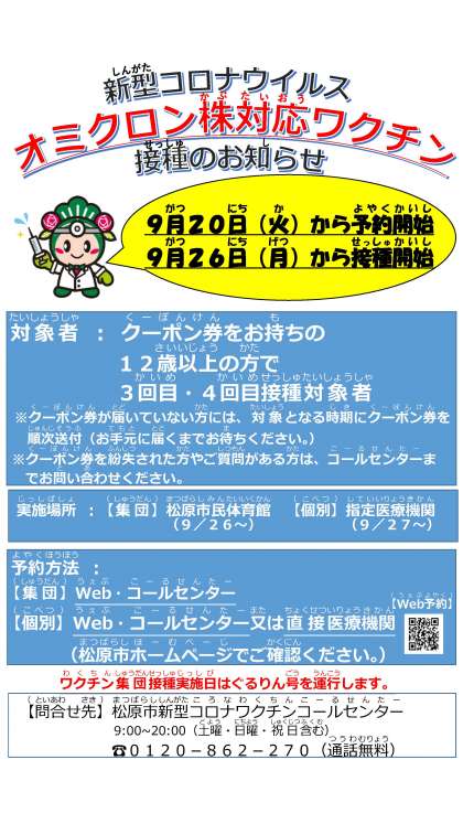 9月22日 新型コロナウイルス感染症オミクロン株対応ワクチン接種のお知らせ 公開日 2022/09/22 更新日 2022/09/22 お知らせ 新型コロナウイルス感染症の従来株とオミクロン株に対応した2価ワクチンの接種について、厚生労働省より方針が示されたことから、9月26日(月)から集団接種を、9月27日(火)から市内の医療機関での個別接種を開始いたします。 【地域保健課】