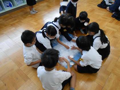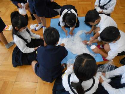 1年生たちが、3教室に分かれて、大きな紙にぺたぺたと綿を貼っています。「何を作ってるの?」と聞くと「くじらぐもー!」と元気に答えてくれました。くじらぐもは、国語の教科書にのっているお話です。ボンドをのばして、ぺたぺたと根気よく貼っていった結果・・・