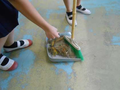 掃除終了のチャイムが鳴っても、「こんなに集まった!」と下足室で砂を集めている6年生の人たちに感謝の一枚♪