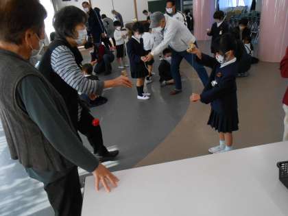 天美駅の近くにある、弁天苑からたくさんの方に来ていただき、1年生と遊びの交流会をしました。