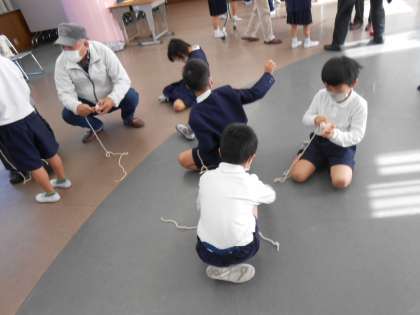 ↓コマ回しをしています。こちらも初めて回す子が多く、巻き方、持ち方、投げ方をていねいに教えてくれました。