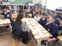 1年生は、学校の外をいろいろ回って、図工の時間に使う材料を集めていました。葉っぱや木の枝を画用紙にはって自分が作りたいものを表すそうです!