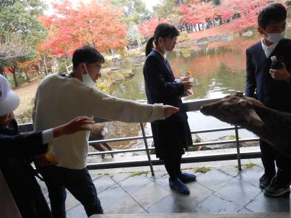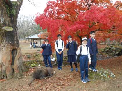 6年生 奈良へ遠足3 公開日 2022/11/29 更新日 2022/11/29 6年 少し早めのお弁当タイムです。ゆっくりおやつを食べることができました。 しかし、子どもたちの食べ物をねらう鹿たち…。無理に刺激をせず誘導して、じわじわと子どもたちから遠ざける攻防がくり広げられました! 最後に、班ごとにとってもきれいいだった紅葉と、鹿といっしょに写真を撮って、奈良公園を出ました。