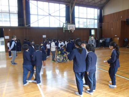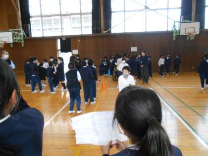 4年生と、たんぽぽ学級のみんなで、○×クイズをして楽しみました。実行委員の人たちが前日にたんぽぽ学級の人たちにインタビューをして、できあがったクイズ(例えば、「□□さんの好きな乗り物は、△△である。○か×か。」のようなクイズです。)なので、たんぽぽ学級の人たちのことを知るきっかけにもなったと思います!
