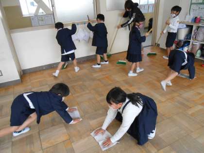 上:1年生。教室掃除を力をこめてできるようになっています!