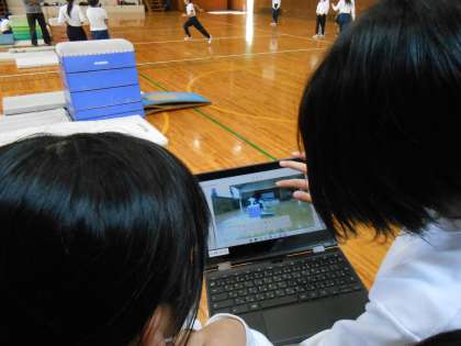 4年生は体育の時間に、とびばこの学習を進めています。次とぶときにがんばることを見つけやすくするために、自分のとびかたをクロムブックで友だちに録画してもらい、すぐに自分のとびかたを見返していました。
