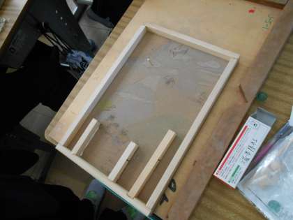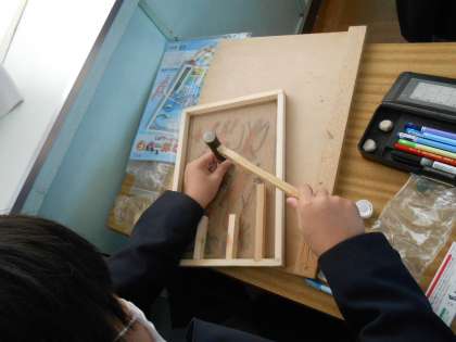 3年生 図工 コリントゲームの釘打ち 公開日 2022/12/15 更新日 2022/12/15 3年 枠を釘で固定して、ビー玉が当たる釘打ちが始まりました。ビー玉がおもしろい動きになるようにいろいろ工夫して釘を打っていました。