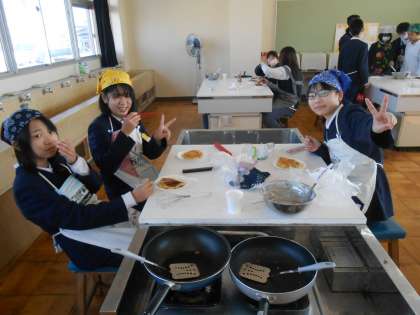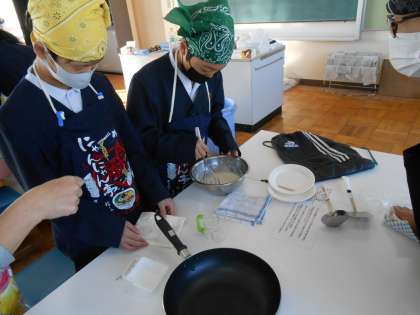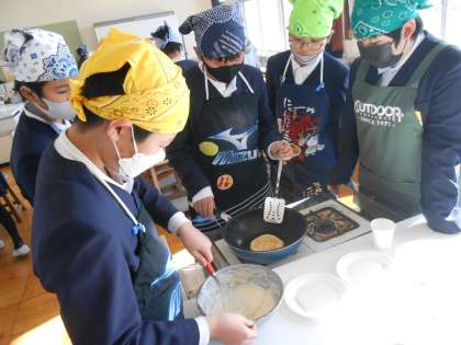 6年生 調理実習「ホットケーキ」 公開日 2022/12/20 更新日 2022/12/20 6年 6年生は調理実習でホットケーキをつくりました。火加減がバッチリできれいにできたグループは、「めっちゃおいしそう!」とたくさんの他のグループの人たちにのぞかれていました♪少しこげてしまったグループも、ニコニコでホットケーキをたいらげていました。みんなホッとできていました!