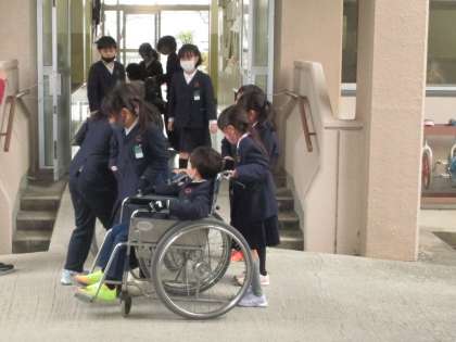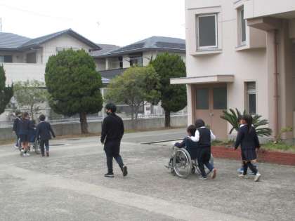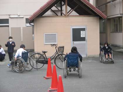 一人で、車いすに乗って障害物をさけて通ったり、班で、中庭や校内を通ったりして体験しました。