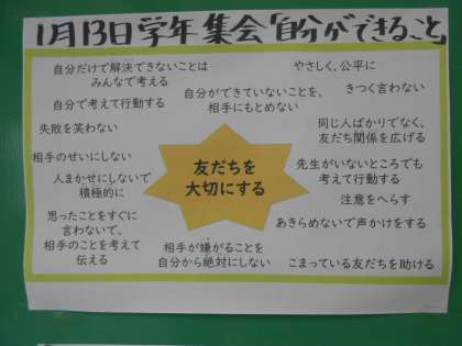 3年生は、2学期にいろいろと学年全体で話をしてきました。そして、3学期に「自分ががんばること」を考える学年集会のまとめを13日に行い、そのまとめを掲示しています。