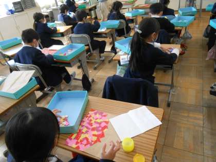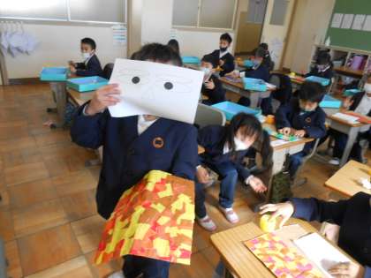 1年生は図工の時間に、節分に向けて鬼のお面を作っていました。となりには同じ色を貼らない、などのルールのもと、ていねいに色紙をちぎって、貼って・・・さて、これは何になるのでしょうか♪