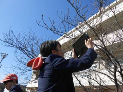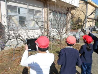 4年生は理科の学習で「冬探し」をしました。冬芽をタブレットで撮影している人がたくさんいる中、畑に行ったり、土の湿ったところに行って生き物を探している人もチラホラ。どんな冬が見つかったかな?