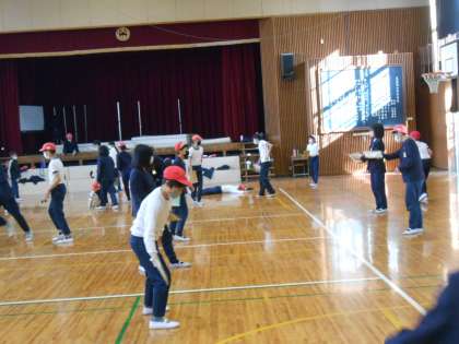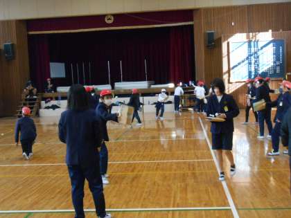 6年生は、体育の時間にテニピンをしました。テニピンは、小学校で行えるテニス型ゲームです。手のひらにダンボールで作ったラケットをはめ、ボールを打ち合います。今日は、感覚をつかむためにピンポン球で練習をしました。(本当のボールはもっと大きくてやわらかいです。)みんな楽しそうに練習をしていました!