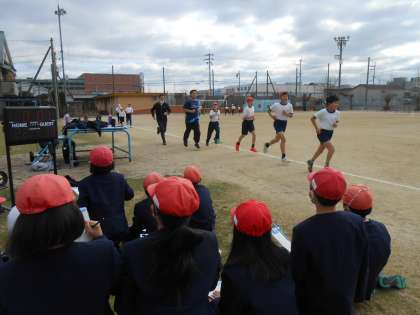 5年生も、5分間走をペアの人に記録をとってもらいながら交代で走りました。前半組にも後半組にも担任の先生がいっしょに「いいペース!」「そのペースで!」と声をかけながら走っていました。子どもたちは励まされながら一生懸命走っていました!