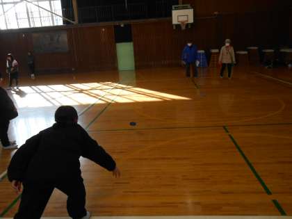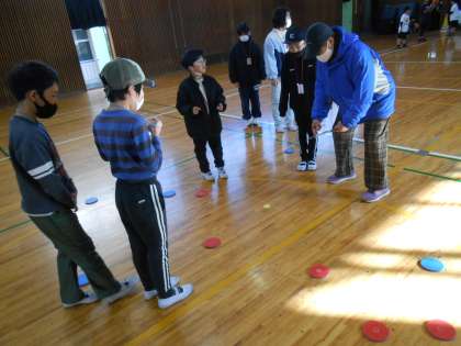 体育館の半分で、ディスコンをしました。的となるディスクに赤と青どちらのチームが近いかを競うもので、「カーリング」とか「ボッチャ」に近いスポーツです。回数を重ねるごとに、うまく投げられるようになっていました!