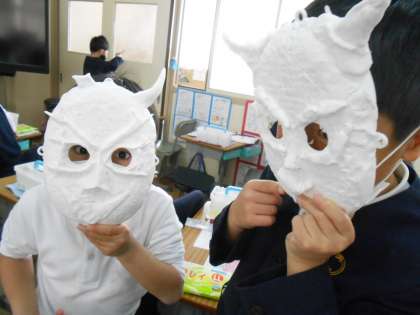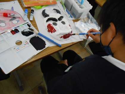 3年生は、鬼のお面への模様つけと、色つけが始まりました。「こわさ」を表す人もいれば、「明るい」感じを表す人もいました。