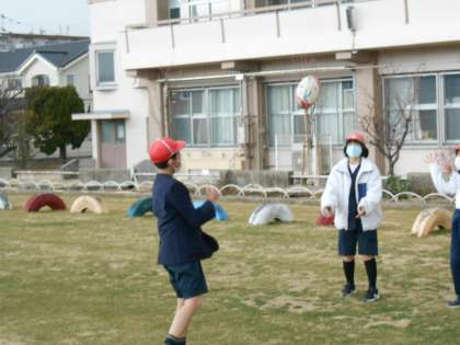 5分間走のあとに、ラグビーボールにふれ、パスの練習をしました。今後タグラグビーを5年生もするそうです。どこに転がるかわからないラグビーボールに慣れてくださいね!