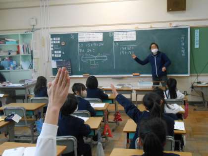 「みかんが15こあります。なんこか買ってきたのでぜんぶで32こになりました。なんこ買ってきましたか。」という問題を考えました。どんな式になるか、どうしてその式になるのかをみんなでいろいろな意見を出し合いながら考えていきました。意見をぶつけ合わせながら、「だって・・・」「それだと・・・」と子どもたちの言葉で解決されていきました♪