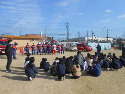 何台もの消防車、何人もの消防団の方に来ていただき、5時間目はランチルームでお話を聞き、6時間目は煙避難体験、放水体験をしました。