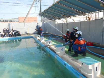 煙が充満した部屋は全く周りが見えず、煙の中を避難することの難しさが分かりました。放水体験では、実際に使われるホースを使わせていただきました。思った以上のホースの重さ、水圧の強さに驚きました!