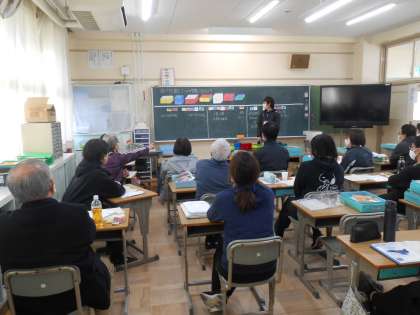 大学の先生に来ていただき、学校全体で研究してきた算数の授業を観てもらいました。子ども役として先生たちは椅子に座り、授業を観ました。大学の先生にいろいろと教えていただいたことを、子どもたちに返していきたいと思います。