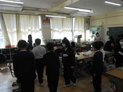 4年生 英語の時間 公開日 2023/02/15 更新日 2023/02/15 4年 「ターンライト!」「ゴーストレート!」「ストップストップ!」 教室内を二人一組で、英語で言われた指示通りに動くゲームです。ワチャワチャ楽しみながら英語に親しめています!
