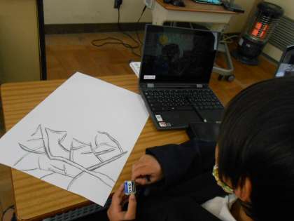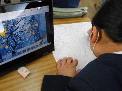 国語の時間に学習した「モチモチの木」の世界を描こうとしています。オリジナルでカラフルな木になりそうです♪