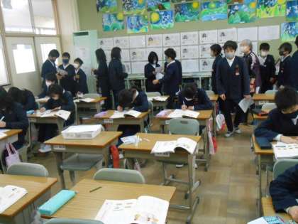 5年生 道徳の学習 公開日 2023/02/24 更新日 2023/02/24 5年 学習したことのまとめを黙々と書き、書き終わった人から後ろに行っています。そして、書き終わった人同士がどんなまとめをしたかの交流が始まりました。共感的に聞く態度も素敵な5年生たちでした♪
