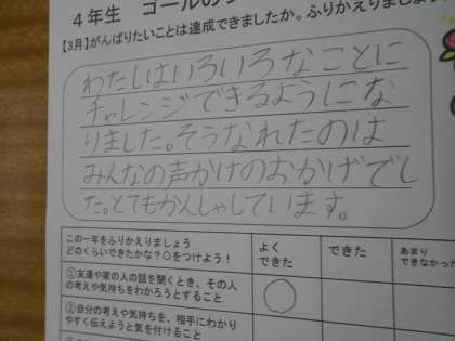 1年のしめくくりの週。4年生は、1年間のふりかえりの時間をとっていました。自分ががんばりたいことは達成できたかを自分の言葉でまとめていました。たくさんのことができるようになったこと、そこにはたくさんの友だちの力があったことをまとめている人が多くて感心しました!