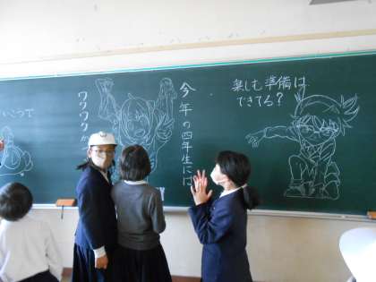上:教室に4年生へのメッセージと絵が描かれていて、子どもたちはとても喜んで見ていました!