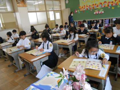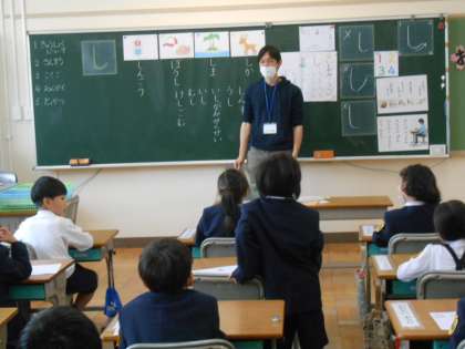上:ひらがなを学習しています。「し」を学びました。言葉集めのときには、知っている言葉を発表し、黒板に書いてもらってうれしそうにしていました!