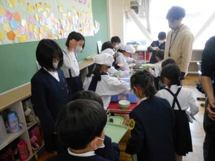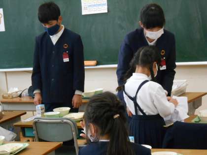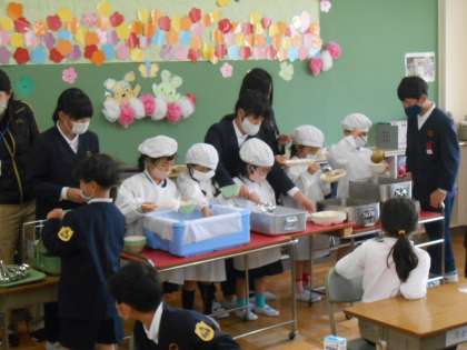 1年生の初めての給食、6年生のお手伝い♪ 公開日 2023/04/17 更新日 2023/04/17 6年 1年生は、初めての給食の日でした。1年生は初めて給食のエプロンをつけて、6年生が、もりつけの補助をしました。エプロンのたたみかたも教えてもらいました。今週いっぱい教えに行きます。6年生もいろいろと成長できる時間です♪