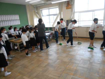 下:今日から1年生は、掃除が始まりました。今日は6年生にお手本を見せてもらっていました。前の人についていく形に「電車みたい!」とつぶやいている人もいました♪
