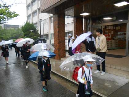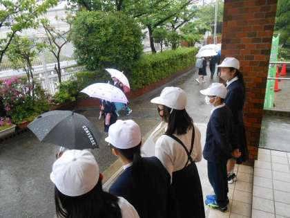 実際にあいさつ運動が始まったのですが、今日はあいにくの雨。声が出ないかな、と少し心配しましたが雨をふきとばすほどのチームワークとパワーであいさつをする代表委員とそれに返そうとする人たち! 晴れない気分をふきとばす力は、さすが6年代表委員です!