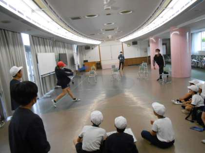 上:球技クラブ:本来なら外で行います。でもバットをふりたい人たちのために、ランチルームを使って、特別ルールで野球をしました。(やわらかいスポンジボールを使いました。)