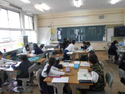 物語文の読み取りで、考えたことをグループ交流する練習をしています。さっと机を動かして司会がみんなの意見を聞いていくスタイルで、できていることを褒められながら、のびのびと学習をしている3年生たちです♪
