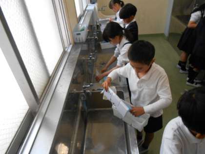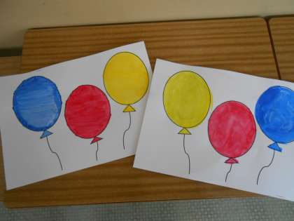 2年生 図工 はじめての絵の具 公開日 2023/04/28 更新日 2023/04/28 2年 今日は初めて絵の具セットを使ってみました。風船の中を、いろんな色で同じ方向にぬっていきました。筆、パレット、水入れを洗うのも初めてだったのですが、テキパキと片付けもできていました!