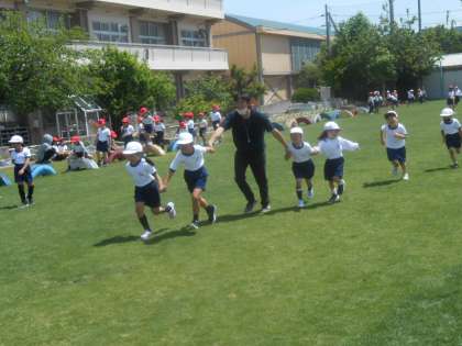 上:休み時間はクラスの友だちと手つなぎ鬼で遊びました。走っている途中で手が離れてしまうこともまだまだたくさんある1年生たちです♪