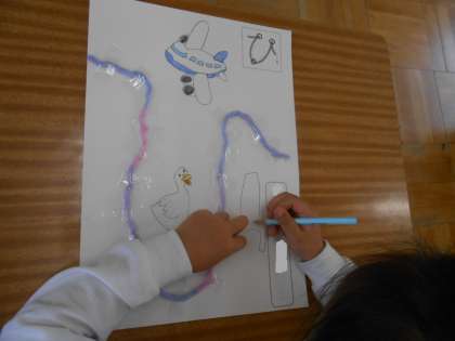 下:ひもをつかって「ひ」の文字をつくりました。バランスを見ながら一人ひとり楽しくつくっていました。できた文字のまわりに、「ひまわり」や「ひこうき」といった「ひ」がつくものをいろいろ描いていました。国語と図工両方合わせた勉強に子どもたちもとても楽しそうでした!