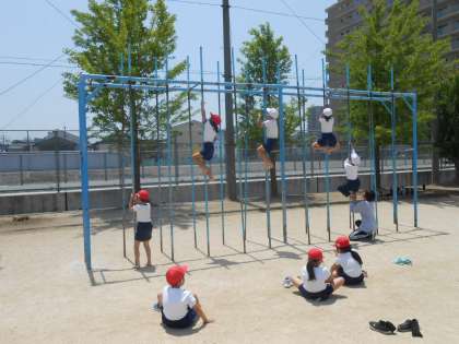 体育の時間に鍛えてきた2年生たちは、グイグイと登り棒を登っていったり、ズンズンうんていを進んでいました。こんなふうになれたらいいね、1年生のみなさん♪