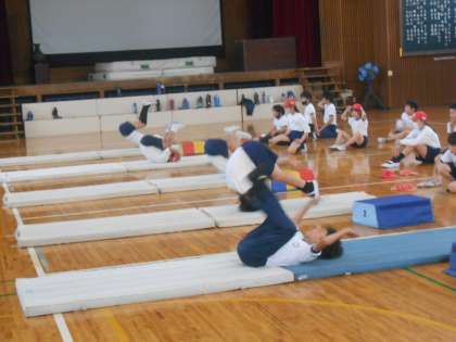 5年生 体育 飛び込み前転 公開日 2023/05/18 更新日 2023/05/18 5年 どの学年もマット運動をがんばっています。5年生は前転するときにできるだけ遠くに手をつけて飛ぶように回る、飛び込み前転をしていました。勇気を出して飛ぶまでに時間がかかる人もいました。失敗や痛みを乗り越えて、がんばれ、5年生!