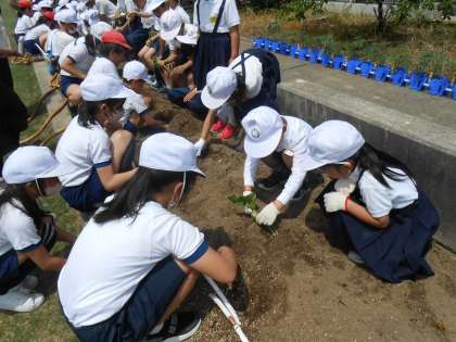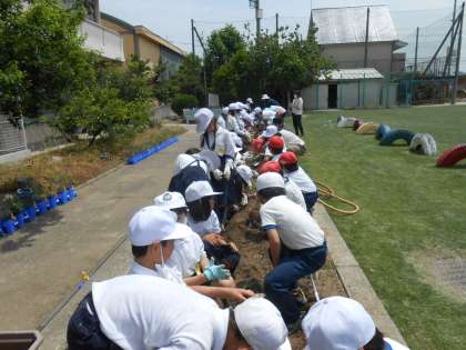 先日、たんぽぽ学級の人たちが一足早く、さつまいもの苗を畑に植えていたのですが、今日は、2年生が畑にさつまいもの苗を植える日でした。4年生との交流もかねて行ったので、お兄さん、お姉さんといっしょにワイワイしながら苗を植える時間となりました♪