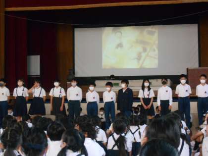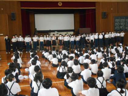 6年生 「折り鶴」を朝会で歌いました。