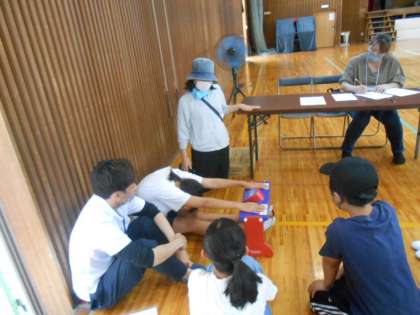 上:体育館では前屈をしました。・・・子どもの体ってなぜあんなに柔らかいのでしょうね。