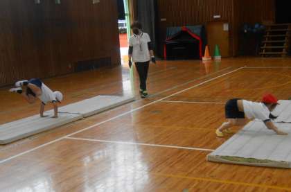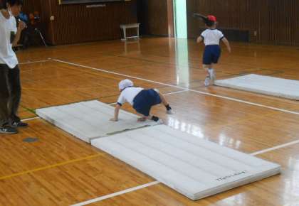 マットを川に見立てて、端から端まで足を移動させる「川とび」をしました。足をしっかり上げることは、今後、前転や、跳び箱運動にも必要な、大事な動きになってきます。