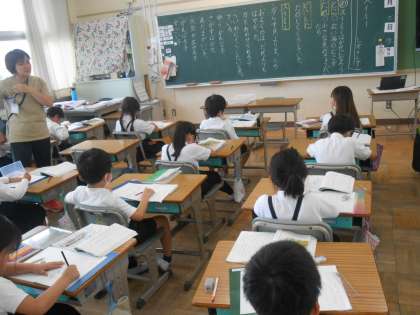 「ぼくが 目になろう」で有名な「スイミー」の学習をしています。今日は「スイミー博士になろう」というめあてで、スイミーはどんな特徴でどんな魚かを考えました。「さがすのがとくい」や「ゆうかんな子」や「やさしい子」などいろいろな意見が出ていました。最後に、スイミーの絵をノートに描いていました。