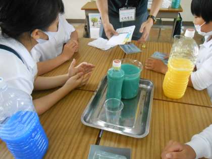 6年生 比とは? 公開日 2023/06/13 更新日 2023/06/13 6年 算数の時間に、青色と黄色の色水をうまく混ぜて、お手本の濃さの緑色をグループごとにつくります。青色と黄色を3はいと2はいの量で混ぜると、お手本通りになったグループが多かったようです。そしてこれを「3:2」と表すと学びました!