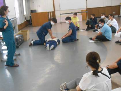 プール指導が来週から始まります。あってはならない事故があったときに、大切な命を救うために、全教職員で研修を行いました。徳州会病院の看護師長さんに来ていただき、話を聞きました。